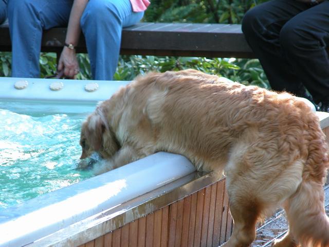 Now he bites at the waves in the hot tub