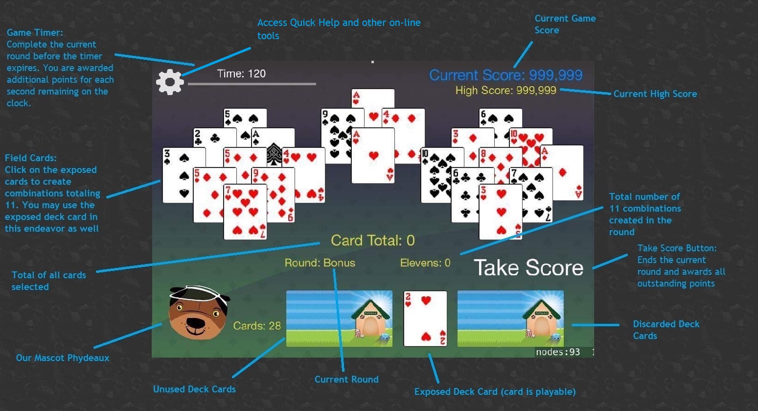 Introducing the Go for Elevens Game Interface: Before playing the game it is helpful to become familiar with the Go for Elevens interface. Some key components of the game are described below (note that the layout may vary slightly depending on your device):