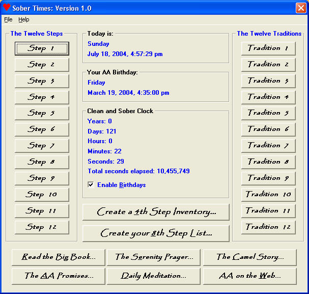 Click the link below to download and install "Sober Times". This tool for the recovering addict or alcoholic includes a daily meditation and prayer, tools for developing a fourth and eighth step, plus a digital copy of the 3rd Edition of the Big Book Alcoholics Anonymous. This digital copy may be be edited to include personal notes and highlights of special passages. In addition, Sober Times includes a real time 'Sobriety' clock which displays the length of your sobriety (no more adding all those numbers in your head!).
